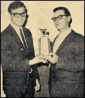 Selected as outstanding junior member of the Clark County Holstein Association this years was William Toburen (left) of Greenwood. He is shown receiving a trophy emblematic of his achievement from Keith Stump, of Distinction Farm at Greenwood, which annually provides a trophy for this purpose. The presentation was made during the annual association meeting in Greenwood Monday night. (Photo courtesy of Extension Service photo Feb. 8, 1968)