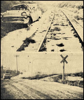 Six people of the Neillsville area, including two small children, escaped with comparatively minor injuries after the station wagon in which they were riding Monday night was carried 1,779 feet by an Omaha railroad freight train. The bottom picture shows the crossing, out of sight around the corner is the upper picture. The train contained 80 cars, was a through freight No. 71 from Marshfield to Altoona, and the trail crew was not aware of the accident until informed by local sheriff’s officers. By that time the freight had been split up and it was impossible to tell immediately what portion of the train the station wagon was attached to. (Press photo Feb. 1, 1968)
