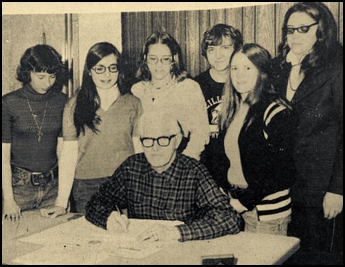 Officers of the Future Business Leaders of American, Neillsville Chapter, gathered around Mayor Kenneth Olson at the high school Tuesday morning as he signed a proclamation proclaiming the week of February 9, “Future Business Leaders of America Week.” From the left those looking on were Lucretia Hediger, Peggy Trybula, Dawn Urban, Dean Schmitz, Linda Opelt, and their advisor, Mrs. JoAnn Chase. (Press photo Feb. 6, 1975)
