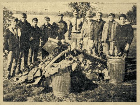 The large pickup load of debris pictured here might have been at the bottom of Lake Arbutus adding to pollution of this recreational water, had it not been for members of Neillsville Boy Scout Troop No. 64. The boys cleaned up the ice after the fishing shacks had been moved off the lake near Campman’s (or Windy) point. The debris was what was left by ice fishermen after they removed their shacks before the March 5 deadline. From left to right, pictured above are Tom Lulloff, Dennis Bertz, Joe Simenson, Keith Steiger, Don Kirn of the Clark County Forestry department, Warden Bob Cleary, Joe Bertz, Kim Kunze, Steve Tesmer and Brad Kunze. E. J. Steiger is Scoutmaster for Troop No. 64. (Press photo March 14, 1968)