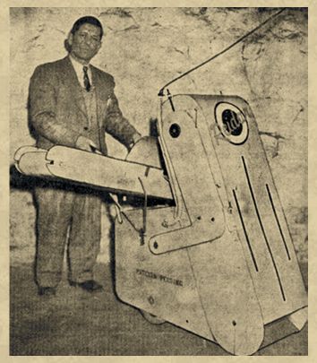 Reider Olsen, who came to Neillsville to manufacture fishhooks and turned his inventive genius to the problems of the dairy farmers, is shown above with his newly developed portable barn cleaner. It is the only portable unit of its kind made, and he completed it 30 days after starting work on the unit. (Press photo March 4, 1948)