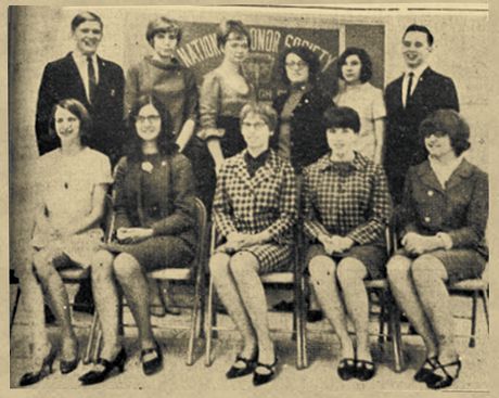 The newest members of the Granton High School National Honor Society are pictured above following their initiation with other members of the society. Front row (left to right) are Bethany Tharp, Elaine Anderson, Eileen Garbisch, and Margie Schlinsog; second row, John Hillert, Linda Burkey, Colleen Angel, Diane Wegner, Linda Johnson and Terry Knutson. The new members are Colleen Angel and Elsie Garbisch, seniors; Diane Wegner, junior; and Linda Johnson and Margie Schlinsog, sophomores. (Press photo Feb. 29, 1968)