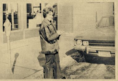 Soon to be in blue is Neillsville’s new Meter Maid, Mrs. Wayne Turville. During her first day and a half on the streets, she had tagged just slightly 100 automobiles for overparking. (Press photo March 6, 1975)