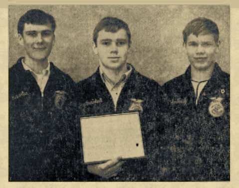 Winner of the State Crops Judging title in Madison Monday was Gary Zschernitz (center) son of Mr. and Mrs. Louis Zschernitz of Rt. 3, Neillsville. The Neillsville crops team places third in the state in team ratings. In addition to Zschernitz, the team placing third was composed of Dennis Sischo and Ronnie Ormand. Their instructor is Richard Quast. (Press photo April 11, 1968)