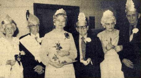Kings and queens of the Clark County nutrition program spring dance held May 1 in Greenwood were (left to right) Mrs. Bertha Combs and Art Wolfram representing the Owen nutrition center; Mrs. Mary Sowieja and Dr. R.L. Barnes representing the Greenwood center; and Mrs. Myrtle Lang and Martin Lautenbach, representing the Neillsville center. (Nutrition program photo May 8, 1965)