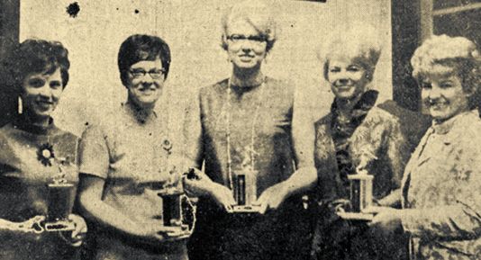 Winners of the Thursday night bowling league display their individual trophies received during the bowling banquet last week. They comprise the Whitehouse team, the members of which are, from the left: Joan Wavrunek, Eileen Zank, Jana Marden, Shirley Anderson and Mary Ellen Bertz. (Press photo May 9, 1968)
