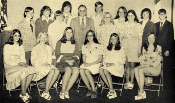 Confirmands Pentecost Sunday at the Neillsville and Granton United Methodist churches were (seated, left to right) Mary Spencer, Shari Oldham, Shirley Stanley, Nancy Fitzmaurice, Susie Henchen, Cheri Diers; (standing, left to right) Tim Tresemer, Bob VandeBerg, Diane Tresemer, Bob Ollech, the Rev. William Noble, pastor of the two congregations, Wayne Kalsow, Lori Marty, Marla Drescher, Cindy Lulloff, Keith Kohnert and Tom Henchen. (Strack photography Neillsville photo May 22, 1975)