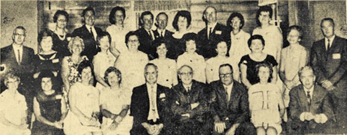 Members of the Neillsville High School graduating class of 1938 who gathered here last weekend for their 30year reunion are pictured above. They are, front left to right: front row–Amber Northup Karl, Ruby Selves Richardson, Helen Puttkamer Kren, Jessie Mills Foemmel, Clifford Vandeberg, Donald Paulus, Eldred Tesmer, Mildred Hefty Wundrow and Louis Bast; second row–Myrna Searl Giertz, Elaine Halle Middleton, Vivian Turner Kopnick, Lavern Kuhl Kopp, Arsula Hubing Westphal, Doris Coffin Schwellenbach, Dolores Scott Wagner, Ruth Skroch Imig, Mildred Wetzel Bozman and Norman Drescher; and third row–Gladys Kraft Reed, Lawrence Dorst, Florence Carl Volp, Glenn Zickert, Floyd Heck, Genevieve Irish Zschernitz, Louis Worchel, Neva Selves Porath and Helen Schmidt Syth (Strack photo July 25, 1968)