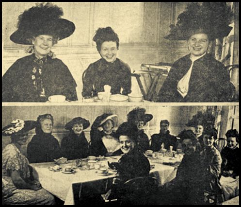 These happy girls are refreshing themselves after making the social rounds last Saturday in their beautiful ancient garb. All eyes were upon them as they walked together through Neillsville’s business section. Upper picture, left to right, Mrs. Millard Cole, Mrs. William Whaley and Mrs. Al Covell. Lower picture, going around the table clockwise from the left: Mrs. Donald Schwantes, Mrs. Harry Wasserberger, Mrs. Lewis Bradbury, Mrs. Odin Wang, Mrs. Millard Cole, Mrs. Tom Noble, Mrs. Al. Covell, Mrs. William Whaley, Mrs. Edna Russell, Mrs. Frank Hepburn and Mrs. Helen Smith. The costumes were brought to Neillsville by Mrs. Millard Cole, who secured them from a relative in Black River Falls, Mrs. Harvey Richards. They were worn originally by Mrs. Julia Price of Black River Falls and Mrs. Elizabeth May of Platteville, both now dead, who were the daughters of a prosperous lumberman in Black River Falls named Campbell. The two large hats, worn by Mrs. Cole and Mrs. Covell, are of more recent vintage dating back only 35 or 40 years. They were originally owned and worn by the Spaulding sisters of Black River Falls. (Noble photo, Neillsville June 12, 1975)