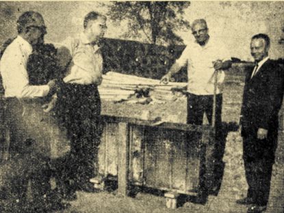 Officers of the Neillsville Industrial Corporation inspected the work in progress at the site of the new Nefco Filter Corporation plant on Highway 10, East, in Neillsville. The 300 by 120foot factory building is being built with the financial participation of the industrial group on a site adjoining the Nelson Muffler Corporation factory building. Left to right above are Jas A. Musil, secretary-treasurer of the industrial group; Dr. Kenneth Manz, director; Frank Svetlik, president; and Donald W. Johnson, director. Other directors are Dr. M.C. Rosekrans, Robert Harvey and Charles Barr. (Press photo Sept. 5, 1968)