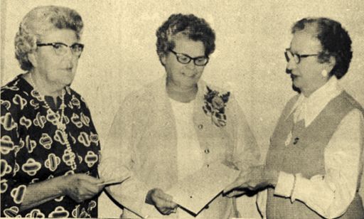 Honored for creating a national prize-winning Royal Neighbors poster, Mrs. Letha Ganther (center) was presented with a certificate of appreciation by (right) Mrs. Pearl Cain, oracle, and a check by (left) Mrs. Esther Schmidtke, receiver. The presentations were made Thursday evening at the monthly meeting of Granton’s Fidelity Camp No. 6375 held at the home of Mrs. Violet Spry. (Press photo Sept. 4, 1975)