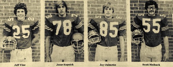 Warriors’ opening 410 effort at Wittenberg Birnamwood last Friday. Jeff Vine, all-conference veteran and a player seen as a potential for Big 10 footballs, was picked on defense for his hardnosed play. Also picked on defense was Jesse Rupnick, a middle guard, whom the coaches tabbed as “very aggressive.” Rupnick is a newcomer, transferring this year from Lincoln High School in Alma Center, where he starred last year. On offense, the coaches picked Scott Meihack, a tough, aggressive senior running back who bulled his way to 168 yards in eight carries, and Jay Ouimette, who scored one touchdown on a Brian McKevitt pass and snared one for two extra points after touchdown. In addition to his running, Meihack was credited by the coaches with a “good job blocking,” while Ouimette was given good marks for running pass patterns. (Press photo Sept. 4, 1975)