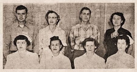 These are the division heads working with Harold A. Applin, the hospital administrator. Mr. Applin is standing third from left. At the left is Duane Coyler, engineer; then to the right, Mrs. Alice Behrens, superintendent of nurses; standing at the extreme right, Mrs. Doris Warren, head of business office. Seated, left to right, Miss Paula Mueller, obstetrical supervisor; Mrs. Erna Langreck, medical technologist; Mrs. Norman Drescher, dietitian; Mrs. Vivian Briski, surgical supervisor. (Contributed photo October 3, 1954)