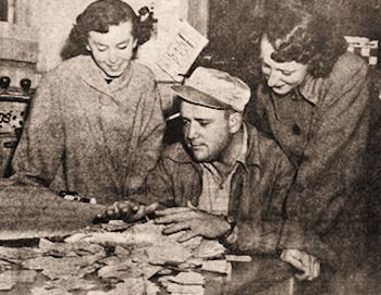 That’s what Pink Van Gorden is telling Gladys Dux (left) and Donna Lee Landgraf, two of the top runners in last week’s tallying for the 1954 Dairy Festival Queen contest. Pink spreads out his hands over a mound of votes on his desk, in a vain effort to hide them from the girls. From the way his chin is set one can tell he “ain’t saying” about the outcome of the race. He did reveal, however, that any one of nine are in position to win. The way to find out “who” first is to attend the Dairy Festival program this (Thursday) afternoon in the new high school auditorium at 2 o’clock. (Press photo Sept. 30, 1954)