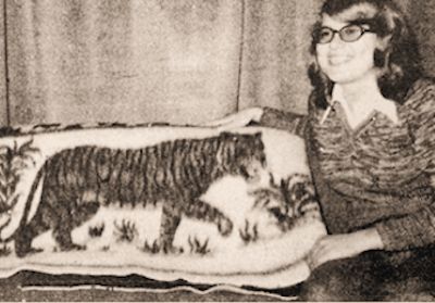 Tiger blankets from Peru are among the souvenirs Cindy Bloom brought home with her after a summer in Lima. She is wearing a sweater of Peruvian variegated wool. She was an International Fellowship student from Loyal. (Press photo Oct. 10, 1974).