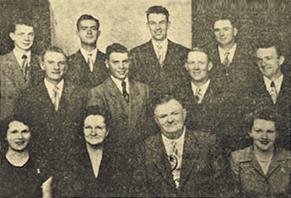 This is a family portrait of the John Schmidt family, who live four and one-half miles south of Loyal on County Trunk K, taken two years ago. Six of the Schmidt’s eight sons have seen army service since the beginning of World War II. The sixth, Anthony, now is enroute to service in Europe. Those pictured are (bottom, l to r): Mrs. Clarence (Sally) Becker of Neillsville, Mrs. Schmidt, Mr. Schmidt, and Mrs. Edward (Florence) Rueth of Loyal; (middle) Bernard, Verland, Henry and Paul; and (top row) Anthony, Robert, George and Joe. (Contributed photo January 7, 1954)