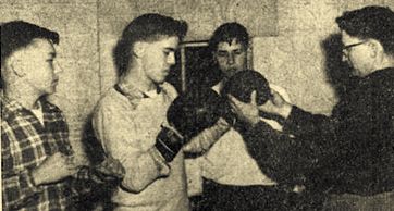 LaVerne Gaier (right) instructs Neillsville’s three Golden Glover hopefuls in defense as they work out in the rear of the Gaier building. These youths have been in training for the last two months. They work out evenings under the watchful eye of Mr. Gaier, a former boxer, in a room that has been equipped with a punching bag, but little other gymnasium equipment. Left to right, the three hopefuls are Billy Hanson, 16, son of Mr. and Mrs. Earl Hanson of Washburn; Charles Gurney, 16, son of Mr. and Mrs. William Gurney; and John Nozar, 16, son of Mr. and Mrs. James Nozar. Young Nozar boxed in the Golden Gloves elimination at Marshfield last Saturday night and dropped a split decision. (Nutrition program photo Jan. 21, 1954)