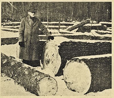 Mr. Leach and his son-in-law, Rudy Volk, cut in 1953, the last important stand of virgin timer in the Neillsville area. They were taking about 300,000 board feet of pine, maple and red oak from Section 31, town of Weston. The log upon which Mr. Leach has his hand measures 39 inches in diameter. (Press photo Jan. 1, 1954)