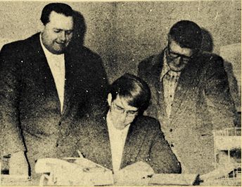 Putting his name on the dotted line, John Abrahamson is being proudly watched over by his father Charles Abrahamson, Loyal football coach, and school principal James Batchelor. Abrahamson was signing a scholarship form for the University of Minnesota athletics. (Press photo Feb. 28, 1974)
