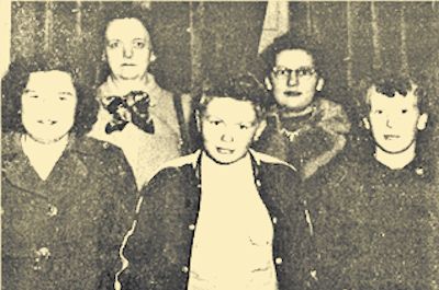 The top team of those to judge on the second day of the county contest here last week was that of the Merryvale School, town of York. Team members and their teachers are pictured above. Front row, left to right: Sharon Nickel, Paul Schlagel and Shelby Tremelling. Back row (l to r) are Mrs. Mary Yankee of Neillsville, the teacher; and Miss Lila Sternitzky Granton, a cadet teacher from the Wood County Normal School. The team’s score was 2,642 out of a possible 3,000 points. (Press photo April 1, 1954)