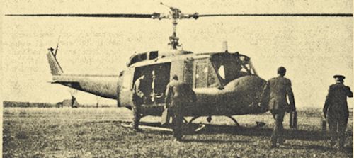 A whopper chopper was a recent visitor to the Neillsville municipal airport, located east of Neillsville on U.S. Highway 10. The helicopter was being utilized to transport officers and enlisted U.S. Army personnel on a recent visit to the local Army recruiter office in Neillsville. The chopper is believed to be the first to land at the airport, which now handles several local flights each week and serves as a touchdown and resting area for pilots on flights from Illinois to Minnesota. (Press photo April 11, 19??)