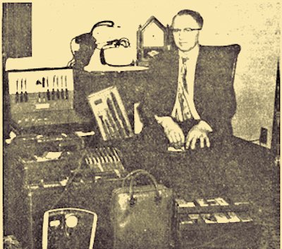 This is Arnold Beyer of Greenwood, manager of Greenwood Milk Products Cooperative, with some of the prizes he has won for expert cheese making. Mr. Beyer has taken the top award of Land O’ Lakes four years out of five and has garnered prizes elsewhere. The collection shown here is only part of what he earned in competition. (Press photo April 22, 1954)
