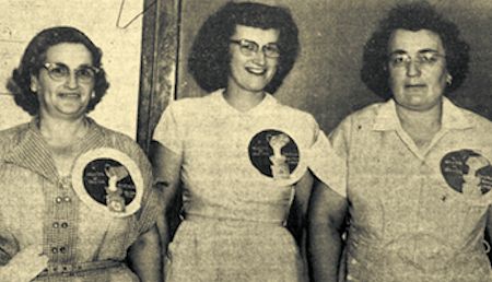Here are three members of the Heintown Club of Homemakers, wearing the badges which won their club first place in the badge contest at Achievement Day. Their badge, worn at the Achievement meeting at Loyal, emphasized the dairy theme. The pail and milk and can were made of foil. The script is in white on a dark blue background. The slogan at the left reads: “A Wealth of Health.” At the right the reading is “Heintown,” followed by the name of the members wearing the badge. In this picture Margaret Tichy, president of the club, is at the left; then, in order, Genevieve Schmidt and Bessie Spangler. (Press photo July 1, 1954)
