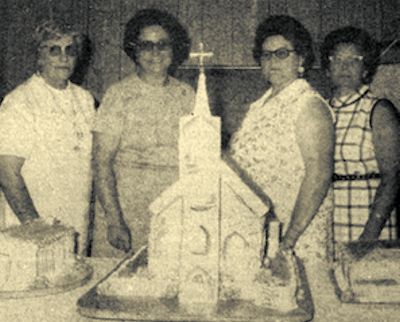 Immanuel Centennial – Cakes for the centerpiece of the head table at the centennial celebration of Immanuel United Church of Christ near Greenwood had been ordered by the Immanuel Guild. Mrs. Robert Susa, Greenwood, created the edible artistry of the church, the parsonage and the schoolhouse to carry out the theme. The centennial book committee is standing behind the cakes (from left to right): Mrs. Alvin Albert, Mrs. Elmer Humke, Mrs. Erwin Toburen and Mrs. Norman Liebzeit. (Press photo July 11, 1974)