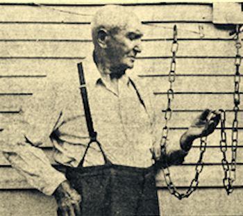 Burton Wells of 302 Court Street, Neillsville, is shown here with a wooden chain which he carved from a fence rail. The chain is just a little less than 70 years old. It was carved out in 1886 or 1887, when Mr. Wells was 16 or 17 years of age. He then had a sprained ankle and whittled out the chain to put in the time. His present estimate is that the job took about three weeks. The basswood rail came from the Orve Cornell farm, now the former Milbreit farm, on the river road, southwest of Neillsville. The piece of rail, when the carving started, was three and one-half feet long. The chain is seven feet long. The doubling of the length was due to the way the links let out when the solid wood is cut from inside them. The wooden chain is a complete replica of an old-style logging chain, with a large hook at one end and a small hook and swivel at the other. The chain is still intact after all these years; no part of it has been broken. It is gilded; has a place of honor in the Wells home. The presentation of this picture is a sequel of the log fence story which appeared in The Press of last week. (Press photo July 8, 1954)