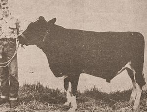 This is Arne Eisentraut, son of Mr. and Mrs. Carl Eisentraut of the Neillsville community. Arne is holding the grand champion of Holstein bull calves at the fair. This is a real aristocrat, his father being Carnation Profile of the famous Carnation family. His mother is Distinction Princess Mary Hello. She has a record of 515 pounds of fat in one lactation and is believed by the Wuethrich’s to be heading for 600 lbs. in the current year. Arne got his bull through the Kiwanis project, the sponsor being H.H. Van Gorden & Sons. (Press photo Aug. 19, 1954)