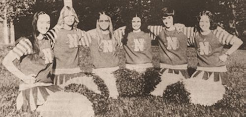 With six giant smiles, the Neillsville High School varsity cheerleaders showed their appreciation and support for the varsity football team, which looks like a powerhouse in the Cloverbelt Conference. The varsity cheerleaders are (l to r) Mabel Benson, Debbie Oestreich, Lynn Corey, Julie Menne, Cindy Kunze and Elien Olson. Alternates not picture are Patty Tibbett and Dawn Urban. The cheerleaders attend all the varsity events, both at home and away, and give the little boost that many gridiron stars rely upon. (Press photo Sept. 19, 1974)