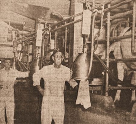 The arrangement is for four cows in a straight line. The fourth cow, at the right, is not shown in this picture. Note that the milk bucket is suspended from a spring scale, making it possible for the operator to know and record immediately the yield from each cow. The figure in the foreground is Victor Nielsen. His left arm rests against the spout, or run, which brings feed down from the hopper above. This feed is allotted to the cow according to her use of it as shown by production. One turn of a handle on a measuring cylinder lets one pound of feed into her pen. The feed is kept in the feed room nearby, and is carried up into a large hopper, which feeds all four of the smaller hoppers. The cloth hanging from the milk bucket is used to dry the cow’s teats, after they have been cleaned by spray of warm water. This milking parlor is equipped upon the pipeline principle, with the milk from all stanchions conveyed by pipe into the milk room, where it flows into a stainless-steel tank. (Press photo August 26, 1954)