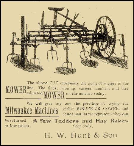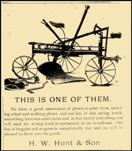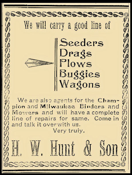 This business featured in the ads below was owned by William Henry Hunt (locally known as "H. W." and "Henry") and his son, Clarence Melzer Hunt.