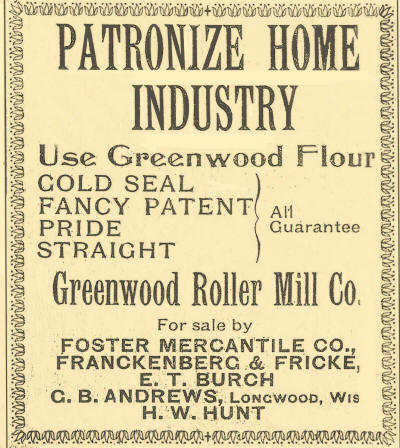 In the fall of 1899, Nathaniel C. Foster of Fairchild, the railroad magnet for whom Foster township was named, erected the "Greenwood Roller Mills" (pictured below). It opened for operation in the spring of 1900, with thirty year old Franklin W. Shrimpton as chief miller and operations manager. Frank learned the skills from his father, an immigrant from England, who was an experienced miller in De Kalb, Illinois. The Shrimptons were a hard working, well respected family. Frank married shortly after acquiring his position at the mill. Edward T. Bailey served as engineer. In 1902, when it was incorporated under the title of the Greenwood Roller Mill Co., with N.C. foster as President; G. A. Foster, Secretary and Treasurer, and F. W. Shrimpton, Business Manager.