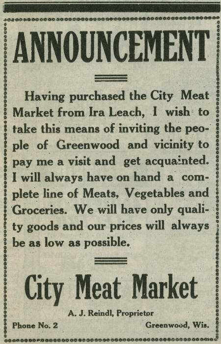 The above advertisement, denoting the purchase of the City Meat Market of Greenwood, WI by A. J. Reindl from Ira Leach (1925 Commercial Club Member), appeared in the Greenwood Gleaner, Oct. 24, 1929. That same issue also carried this note: "For Sale--75 pullets. Inquire of A. J. Reindl, City Meat Market. |