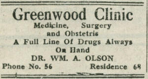 "In my early years in Greenwood," Dr. Olson observed, "doctors always made emergency calls to homes, regardless of weather. I had one of those outfits called 'snowmobiles' and my driver and I often faced blizzard and storm to get to a person in need of medical attention. It never mattered what hour of day or night the call came, or the type of road one had to travel."