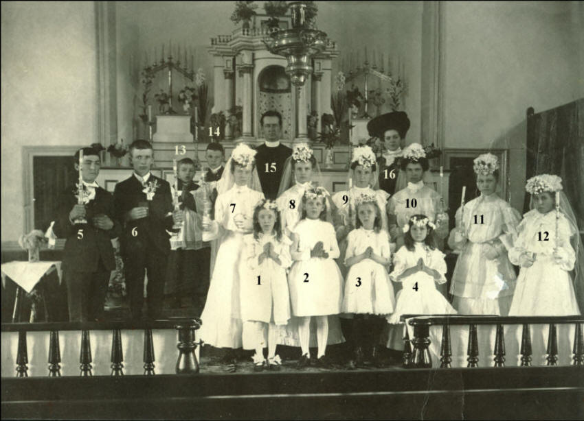 The above photo was found in an old album in the Greenwood Public Library (1881 and Onward) and labeled "Father Pollack, Confirmation, Greenwood". We know that Father Pollack officiated at least two weddings in 1914, so we assume this photo was taken around that time. Please let us know if you can identify any of the people in this picture. Jane Braun researched this photo and located a duplicate in on of the Church Anniversary booklets which identified most of the individuals. That source lists the Priest as "Father Burkart" from Loyal. |