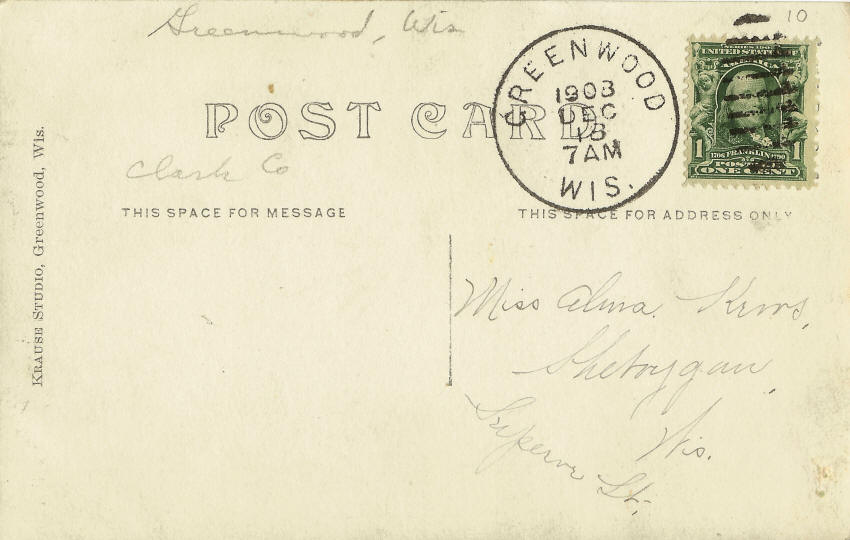 Can you help us identify the addressee on this historic postcard? We believe it may be Alma Kraus/Krauss, based on the fact that "Krause Studio" is stamped on the far left and apparently produced the photo which features the Grand Marshall of the Parade and the Brass Band. Can you identify anyone in the picture?