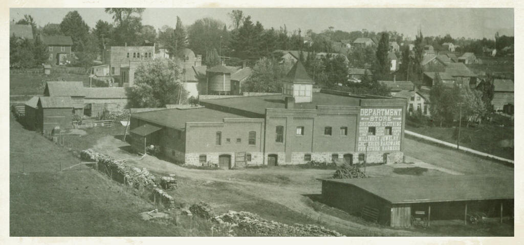 Notice the shed for buggies and wagons which was provided for the shoppers at the "Big Store" which later became "The Farmers' Store".