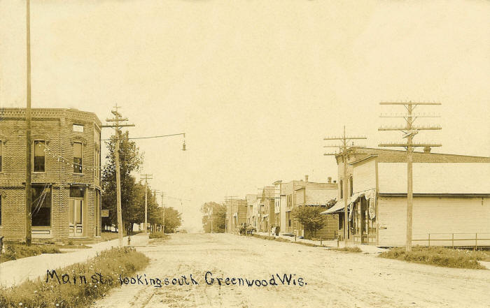 This 1913 post card of the west side Main St., Greenwood, Wisconsin shows some children playing on the north end of the street. The businesses from left to right are: the Sash, Cement & Sewer pipes, A. M. White Hardware, The F & M Bank, John Arend's Grocery and Volk Bros. Taylor Shop (later Jim's Dairy Bar).
