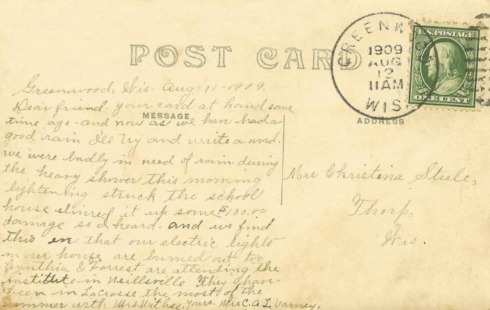 Steele, Thorp, Wis., postmarked 12 Aug 1909, Greenwood, Wis. |
