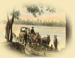 This ferry carried the first settlers across the river, and was a short distance north of the bridge crossing at Eaton Town. The last mentioned trail followed a northerly direction to the top of the hill west of the Black River bridge, or the Harlow hill as this was later known; thence perhaps more north than west over the high ridge for several miles. These trails were naturally rough, owing to the knolls, roots and boulders, and in the low places, new trails would be made around these obstructions, the old track soon growing to thick brush. These roads were a1ways wet, owing to the low level, and the thickly standing timber. Because of the deep mud, no wagons could be used, and the jumper and the pung came into popularity.