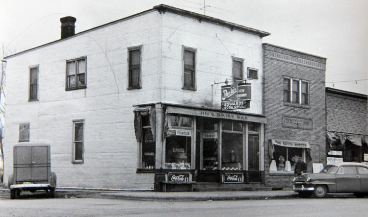 Jim's Dairy Bar was first opened by Jim Neuenfeldt (son of Wm.) 19 Jan 1950. The building was owned by William F. Neuenfeldt was first operated by his son, James Neuenfeldt followed by Raymond "Bud" Ackerman (Bud's Dairy Bar), Mr. & Mrs. Russell Edwards (Edward's Dairy Bar), and Gerald Neuenfeldt (Jerry's Dairy Bar was run by another of Wm. Neuenfeldt's sons). The Dairy Bar was preceded by George Papich's Coast to Coast, Rug Buker's Coast to Coast and Volk Bros. Tailor Shop (photo).
