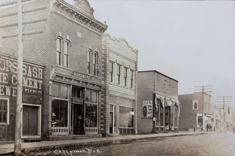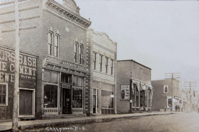 Left to right: White's Hardware, Farmer's & Merchant's Bank, H. R. Baird's Grocery & Volk Brothers Tailor Shop