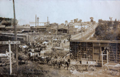 The scene to the left captures the Shipping of Chickens from Greenwood, Clark County, ca. 1909. Notice the sign in the foreground cautioning travelers to "watch out for the cars". |