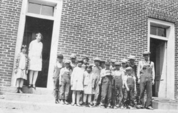 Pine Circle school, students are Evelyn Behnke, Alice Henning, Jane Adler, Elvira Lindow, Vivian Glenzer, Ella Stickert, Irene Gualke, Ellen Drescher, Helen Adler, Grace Stickert, Delores Adler, Martha Grottke, Edith Grottke, Helene Lindow, Verna Gualke. Date unknown, but must be early 1930s (definitely pre-1937).