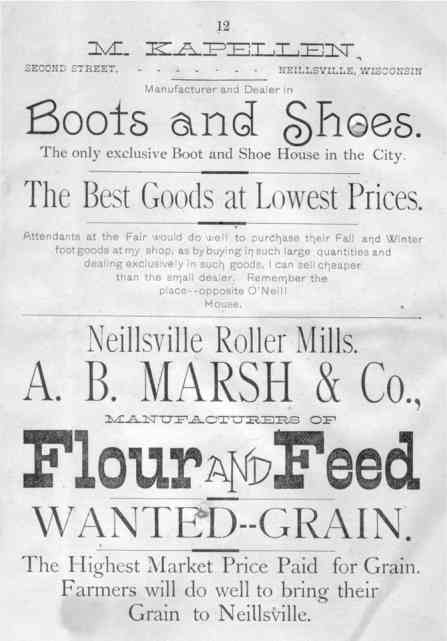 Advertisements: M. Kapellen, Boots and Shoes A. B. Marsh & Co., Neillsville Roller Mills Page 12 of the List of Premiums and Rules and Regulations of the Clark County Agricultural Society, for the Fair of 1887. Web page by James W. Sternitzky PhD, June 29, 2007.Return to Index for the 1887 Fair.