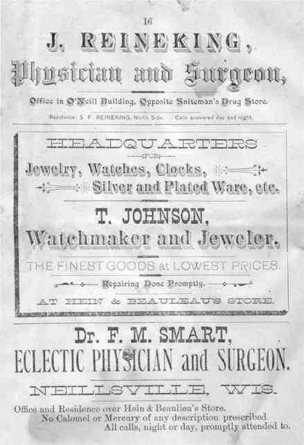 Advertisements: J. Reineking, Physician and Surgeon T. Johnson, Watchmaker and Jeweler Dr. F. M. Smart, Eclectic Physician and Surgeon