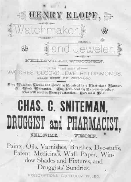 Advertisements: Henry Klopf, Watchmaker and Jeweler Charles C. Sniteman, Druggist and Pharmacist