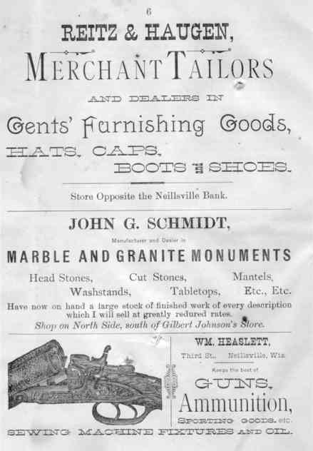 Advertisements: Reitz & Haugen, Merchant Tailors John G. Schmidt, Marble and Granite Monuments William Heaslett, Sporting Goods